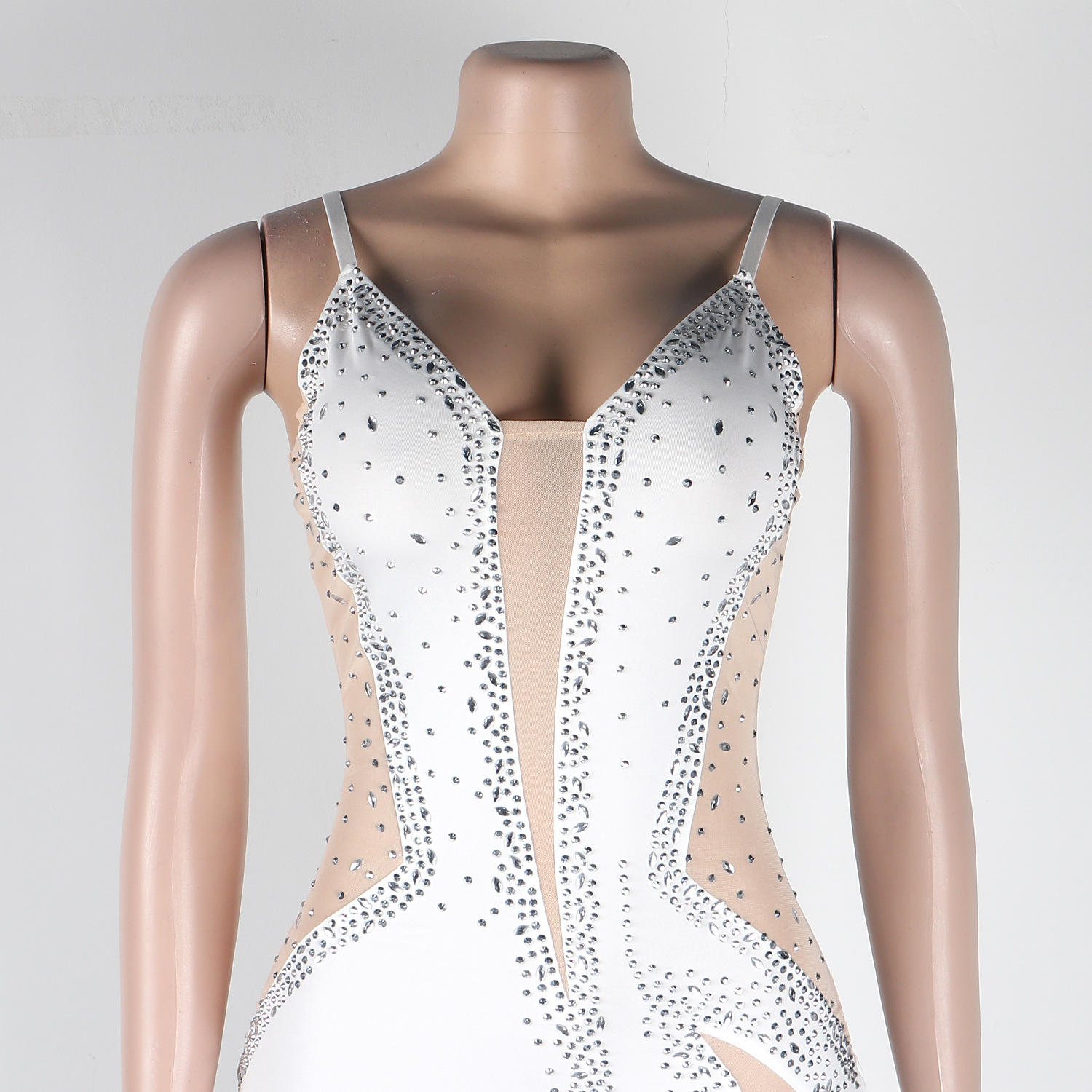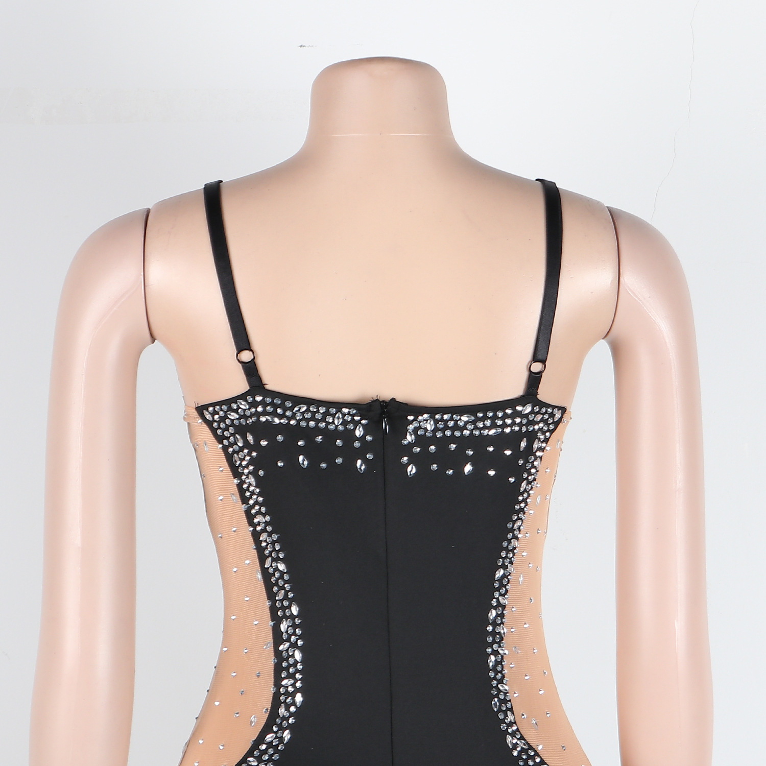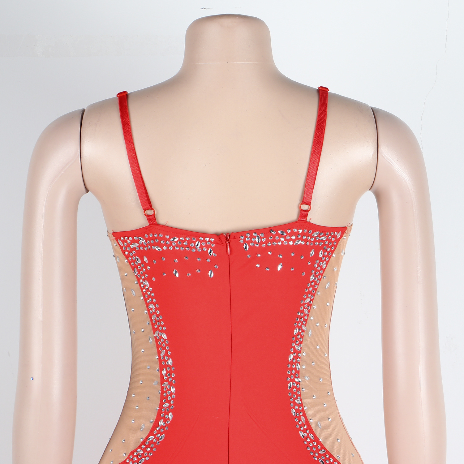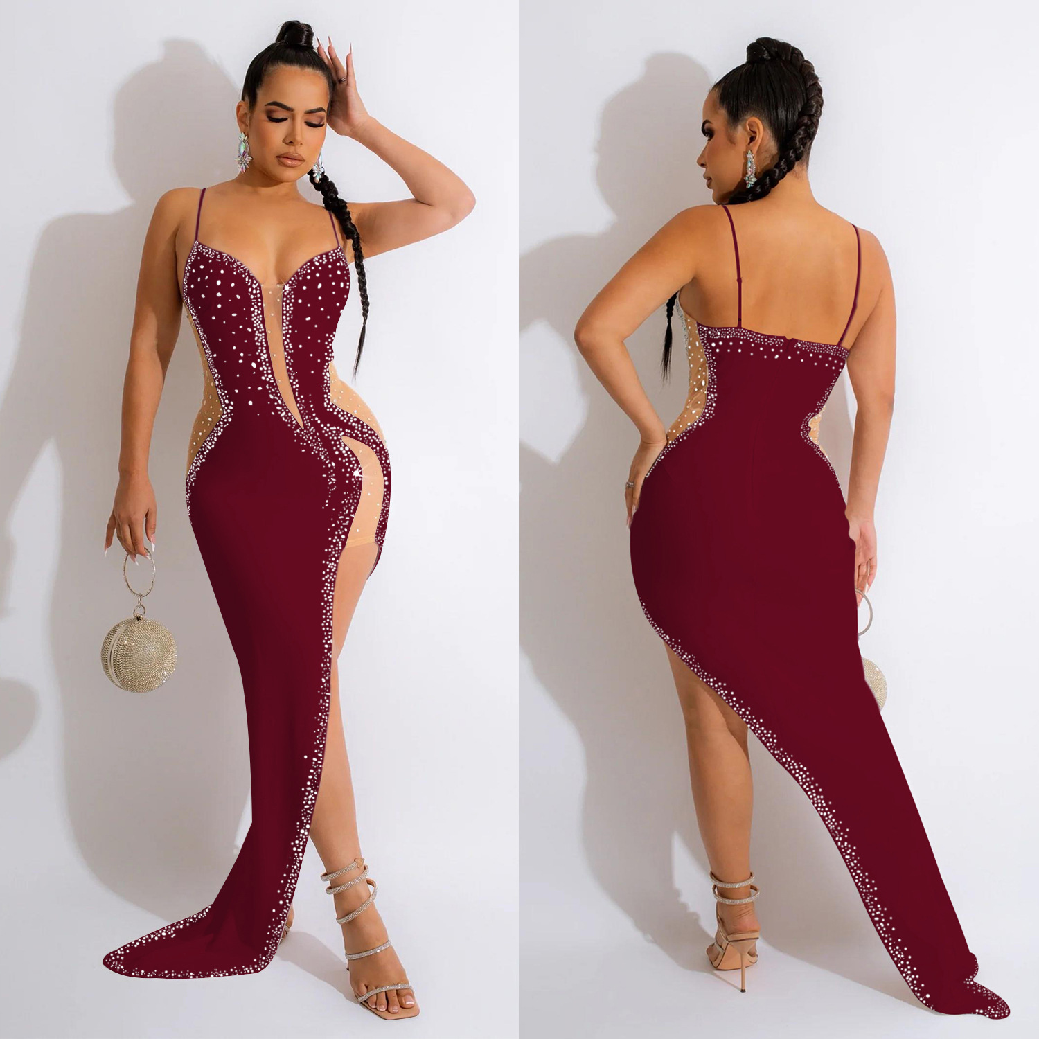 CM.YAYA Evening Dresses Women Diamonds Hot Drill Spaghetti Strap Mesh Patchwork High Low Asymmetrical Maxi Sexy Prom Dress