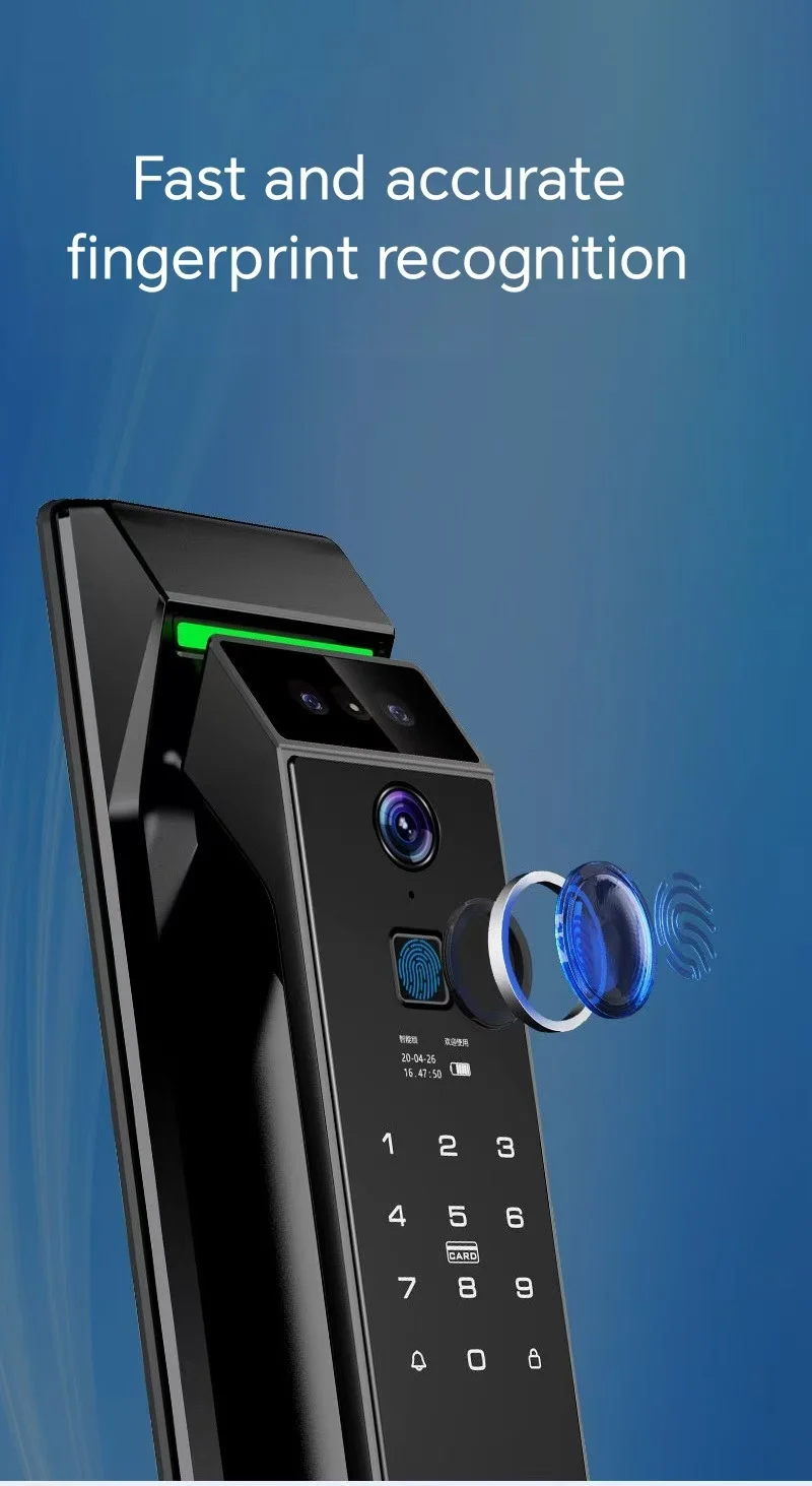 1. Unlock way: Palm Vein,3D face, passward, fingerprint, Card, key, Tuya app. Support temporary. 2. Main features: 2 million pixel camera 4.5-inch large screen Remote video Remote unlocking Active security Wandering capture Infrared fill light Fully automatic locking Anti-theft alarm Trial and error warning Check door lock status Entry and exit records Low battery reminder 3. Power charge: Lithium Battery with USB emergency charging. 4. Mortise: 6068