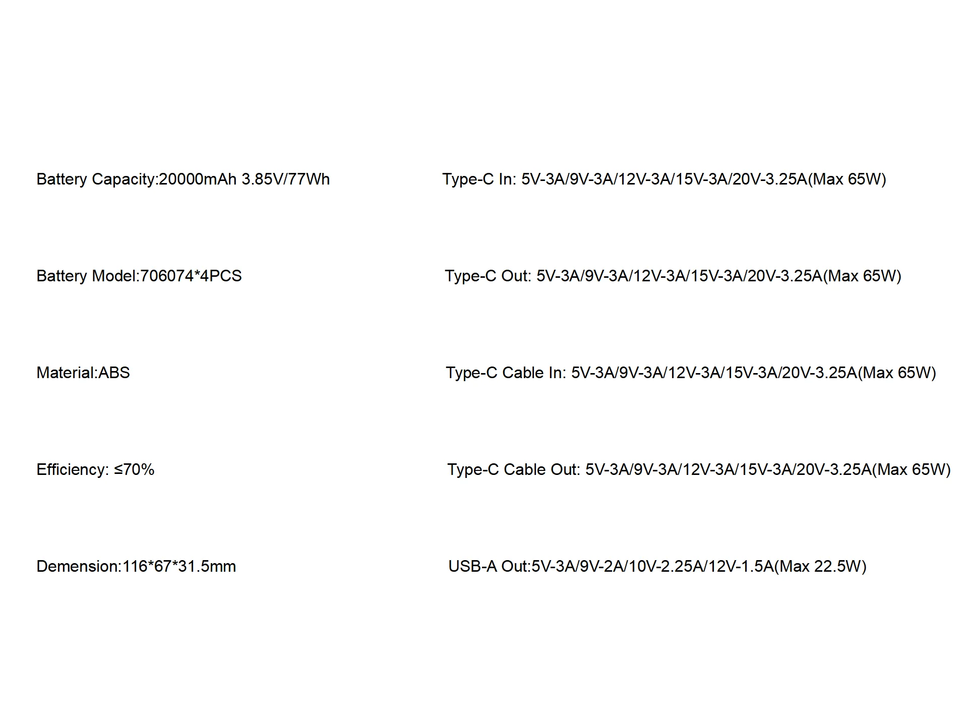 Battery capacity: 20000mAh 3.85V/7Wh