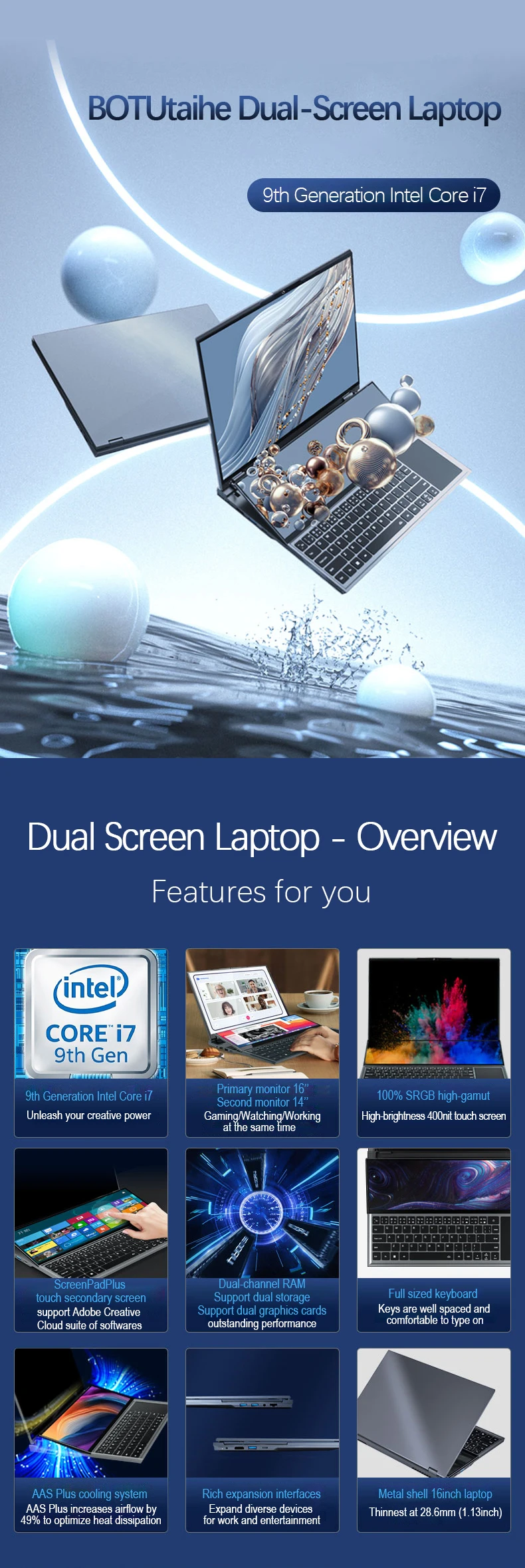 Main screen: 16’’ IPS screen (1920 x 1200) Secondary screen: 14’’ IPS touch screen (1920 x 551) |