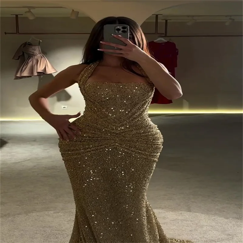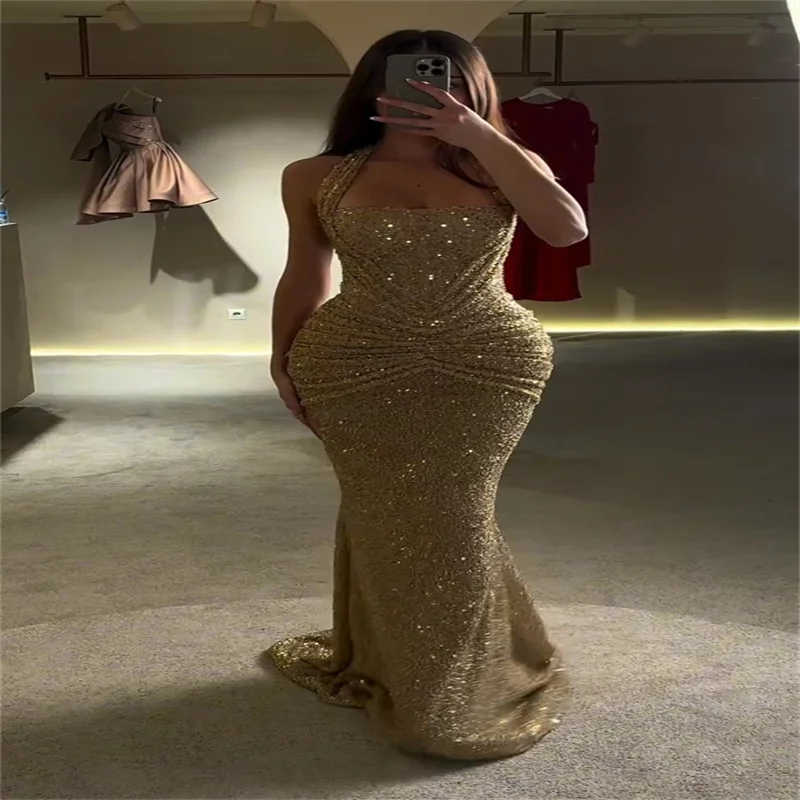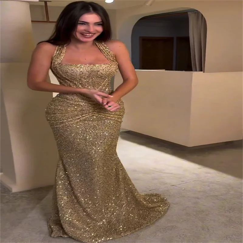 Gold Sequin Women 's Dress Sexy Sleeveless Square Neck Ruched Formal Dresses Female 2026 Spring Party Wedding Evening Event Wear