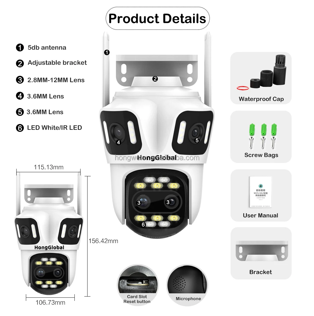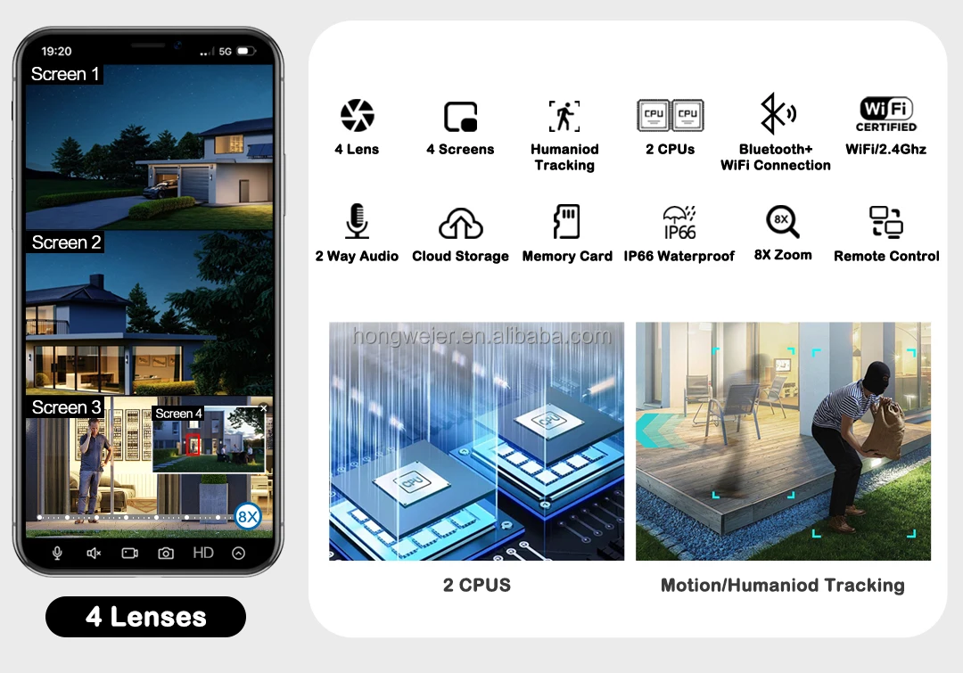 Product Features: (1) Full HD high resolution: 2MP*2Lens and 2 lens*4MP; (2) 12MP 4K 8X Zoom WiFi Outdoor Security Camera; (3) Optional easy connection ways: 2.4G WiFi/Lan Cable; (4) Optional night vision modes: Full color/Intelligent/IR mode; (5) 4 Lens with three screen and 8X Zoom; (6) Two way audio, built-in mic and speaker; (7) Pan 355° and tilt 90°, support motion tracking; (8) Support memory card(default not included) and cloud storage; (9) Support light alarm and voice alarm, push notifications to phone APP; (10) Support to view remotely by APP; (11) Support Alexa and Google Assistant.