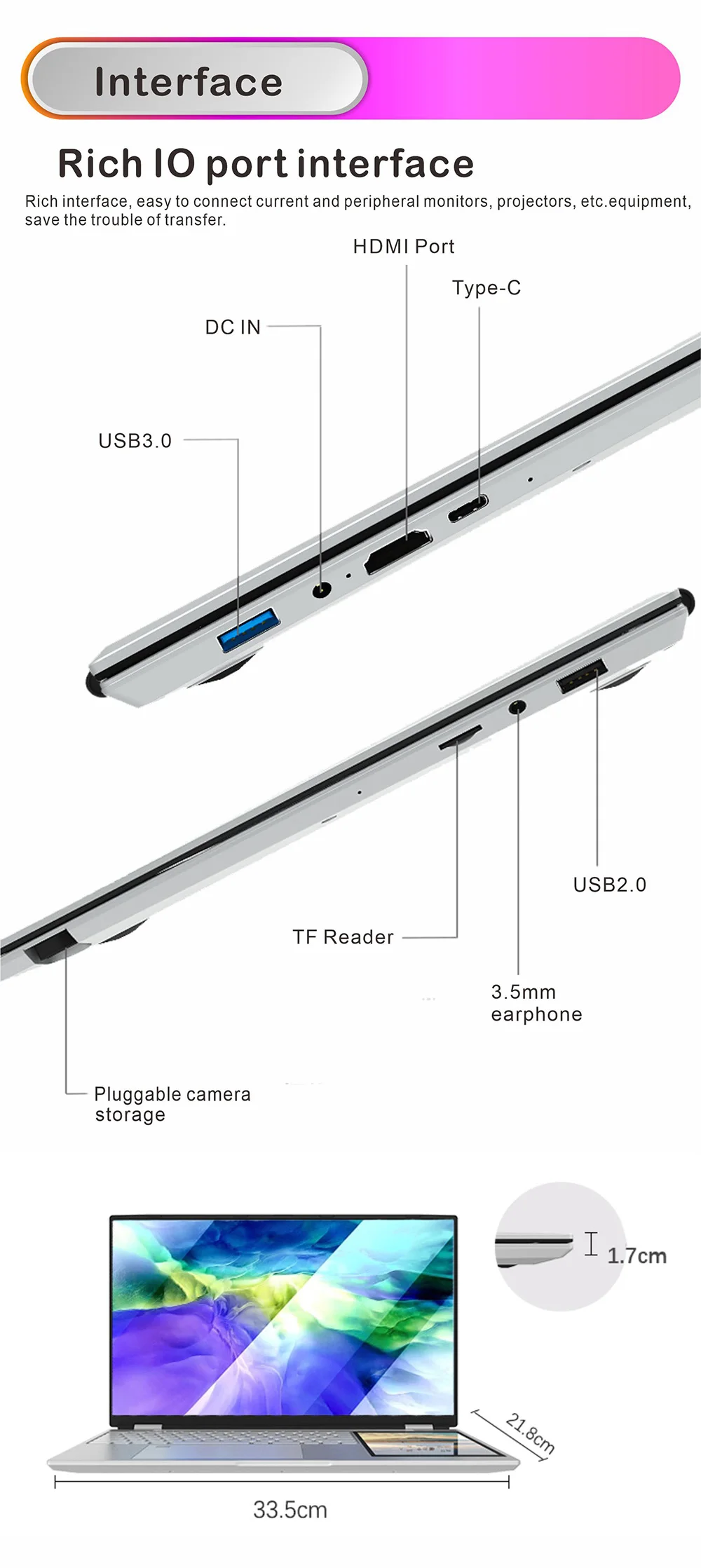 1*USB 3.0, 1*USB2.0,1*Type-C, 1*HDMI ,1*Headphone , 1* DC-IN jack,1* TF card reader |