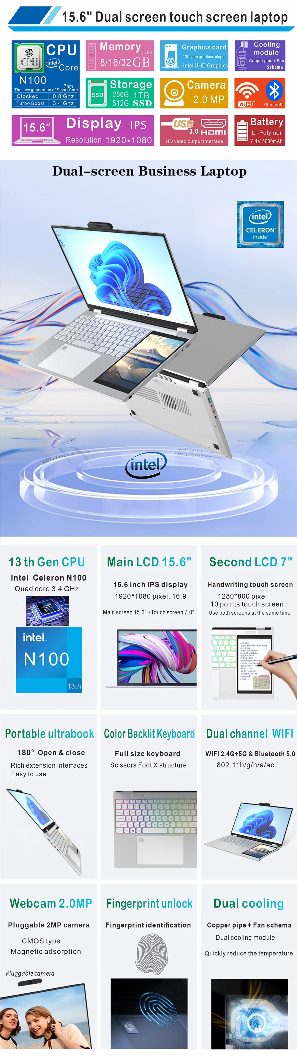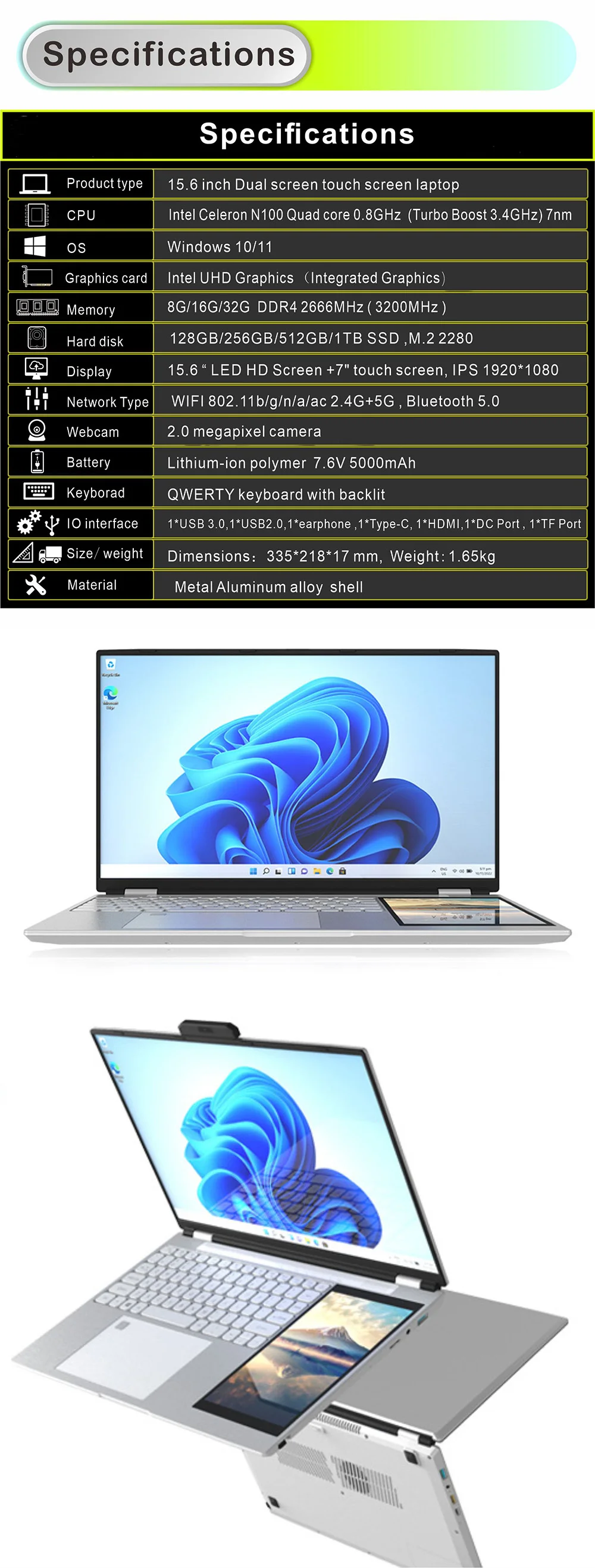 Factory wholesale ultrabook Dual Screen 15.6 "+7" Touch screen Metal laptop |