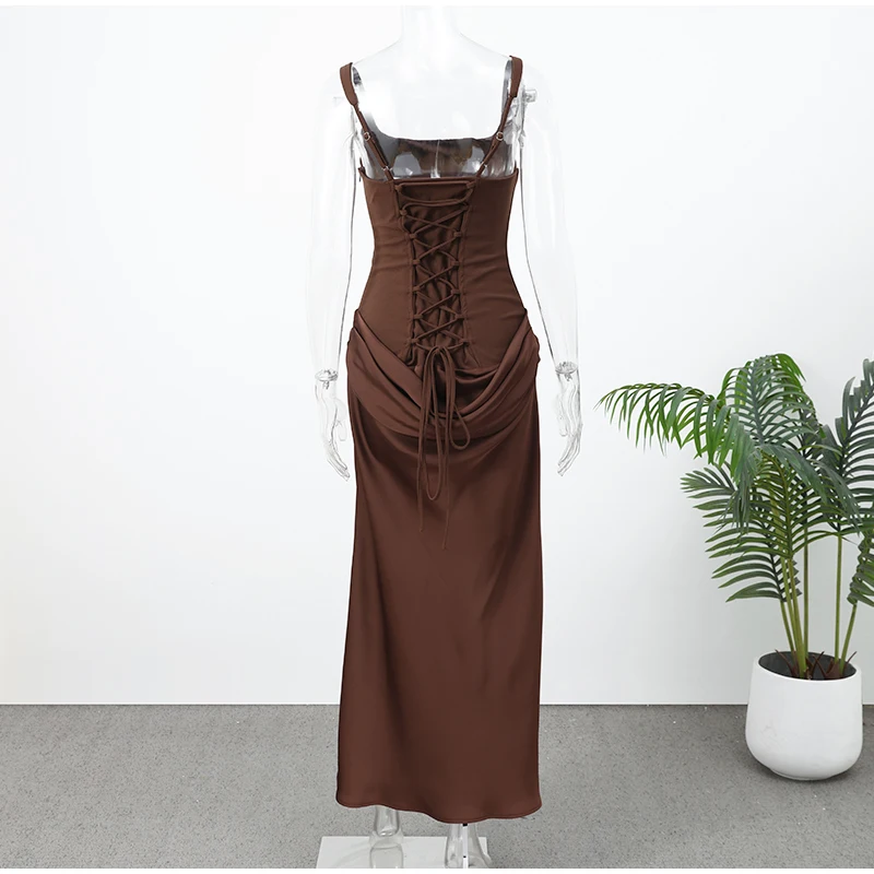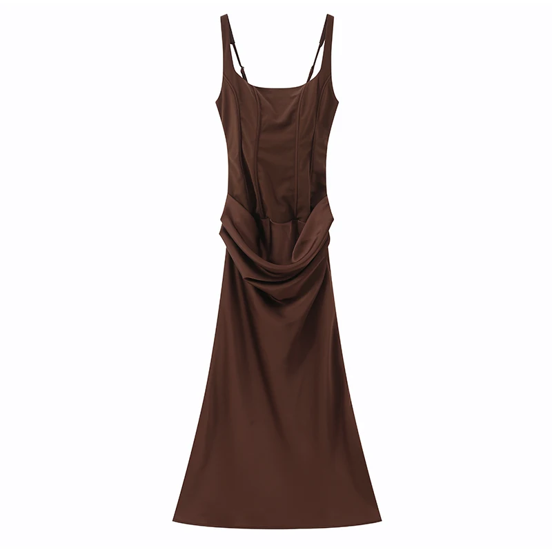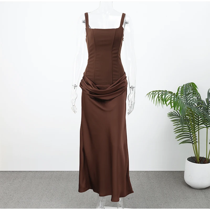 Solid Pleated Sling Dress Women Square Neck Sleeveless Off-shoulder Waist Cinching Slim Dresses Lady Evening Party Gowns 2025